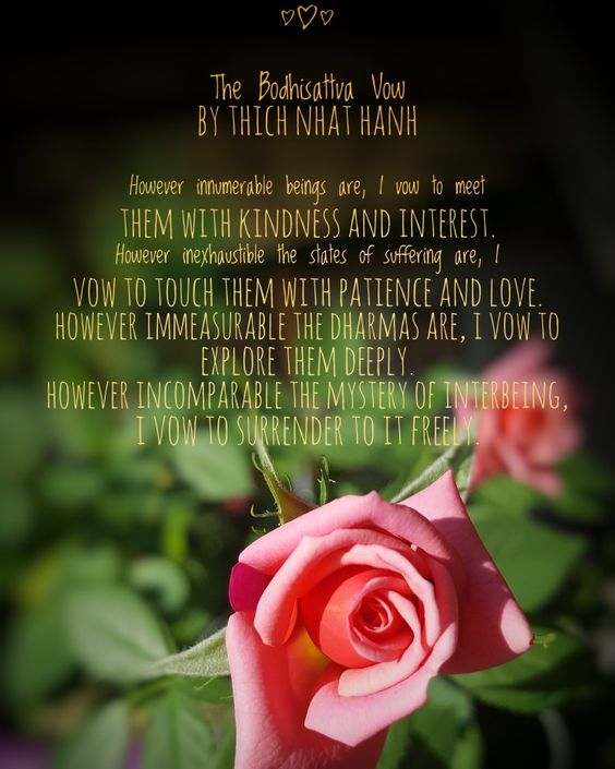 If ever I were to craft a life purpose, these vows seem worthy of that. Our culture, many religions, and numerous self-help movements greatly exaggerate the need for an overarching guiding principle, so I hate to commit to such a thing no matter how much I may crave it. After all, a vow or a purpose or anything is ineffective as long as craving is involved. These vows are the closest I’ve come to being able to divorce yearning from aspiration.